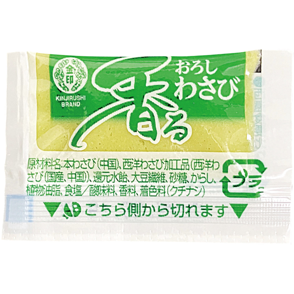 | 原材料 | 本わさび(中国)、西洋わさび加工品(西洋わさび(国産、中国))、還元水飴、大豆繊維、砂糖、からし、植物油脂、食塩 / 酸味料、香料、着色料(クチナシ) |