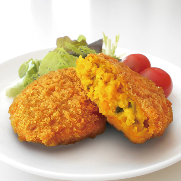 馬鈴薯は一切配合せず、北海道産南瓜の皮まで使用して南瓜本来の香りや甘味を引き出しました。衣は北海道産小麦で焼き上げたパン粉を使用しております。