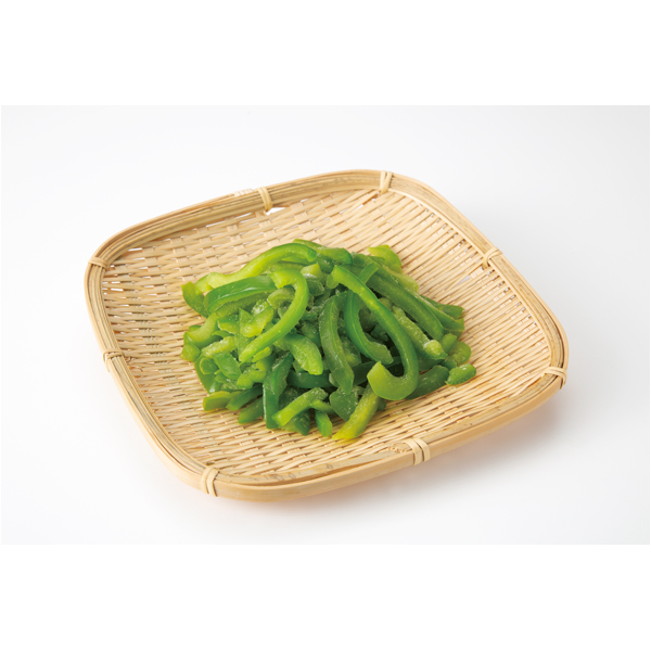 スライスカットしたピーマンを冷凍加工しており、下準備の手間を省くことができます。緑色のピーマンはチンジャオロースや他炒め物など汎用性の高い商品です。
