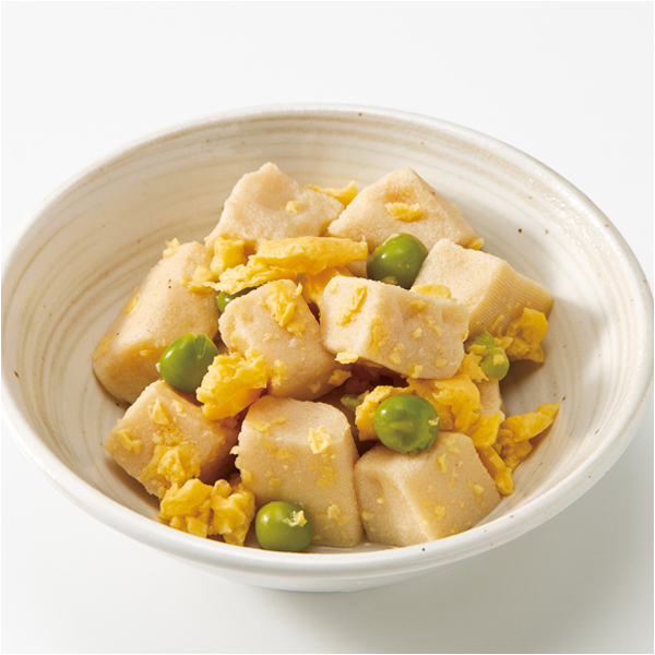 流水解凍、冷蔵庫解凍でもお召し上がりいただけます。こうや豆腐とグリンピースの玉子とじです。