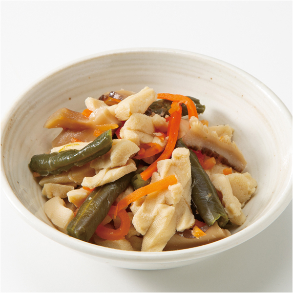 | 原材料 | 人参(国産)、いんげん、凍り豆腐、醤油加工品(砂糖、醤油、みりん)、乾しいたけ、米発酵調味料、かつおエキス、こんぶエキス、食塩/調味料(アミノ酸等)、pH調整剤、豆腐用凝固剤、重曹、増粘剤(グァーガム)、(一部に小麦・大豆を含む) |