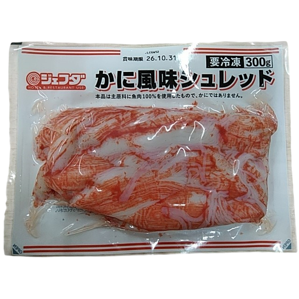 | 原材料 | 魚肉(アメリカ、タイ、その他)、卵白、でん粉(小麦を含む)、砂糖、食塩、大豆たん白、魚介エキス(えび・かに・魚醤(魚介類)を含む)、鶏卵、植物油、植物せんい/加工でん粉、調味料(有機酸等)、香料、トマト色素、パプリカ色素 |